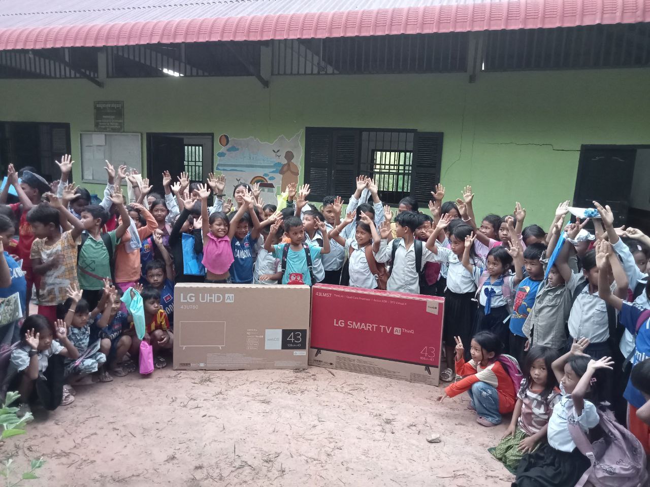 The air was filled with cheers and small hands raised in excitement today at our project site! We are thrilled to share a major milestone for Rainbow New Generation 2015: the arrival of two brand-new 43-inch LG Smart TVs dedicated to our English language programs.